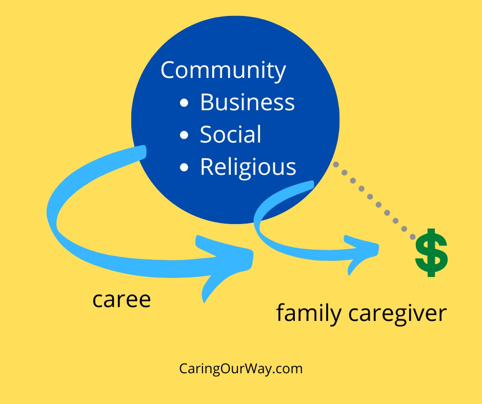 When caregiving begins, our caree drops out of the community. Then, as the help we provide intensifies, we drop out, too. That means we no longer spend money in our communities like we once did.